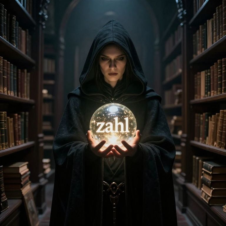 Zahl, a mysterious character in a dark cloak holding a glowing orb with the word 'zahl' inscribed, standing in a dimly lit library filled with ancient tomes, dramatic lighting, fantasy realism