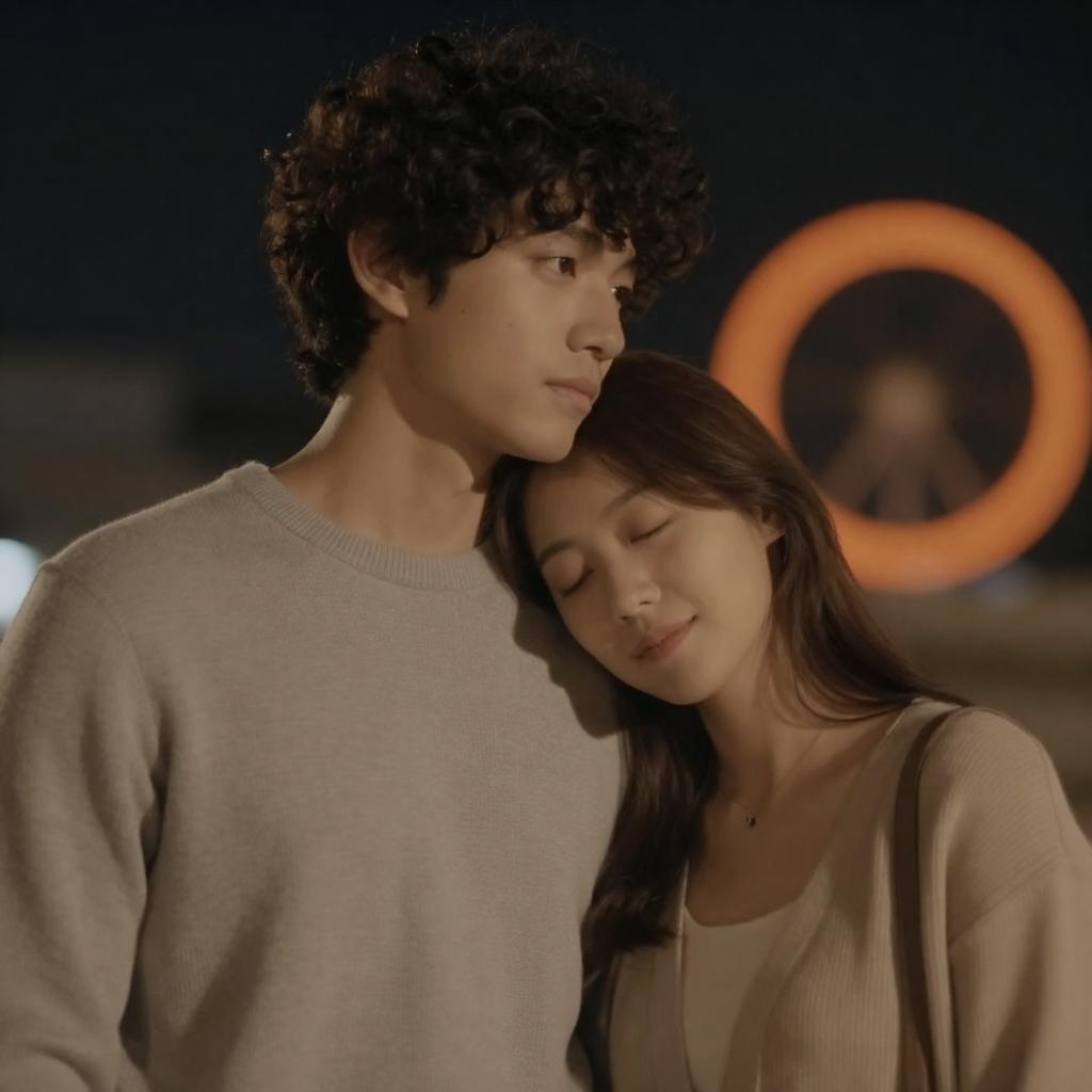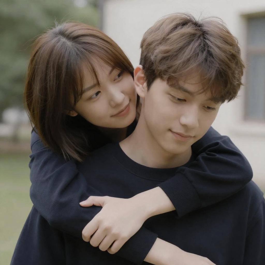 Photograph of a young couple in an outdoor setting. The woman with short brown hair and fair skin embraces the man with light brown hair and fair skin from behind. Both wear dark clothing. The man looks down with a slight smile, while the woman's face is close to his shoulder. Background includes blurred greenery and a white building.