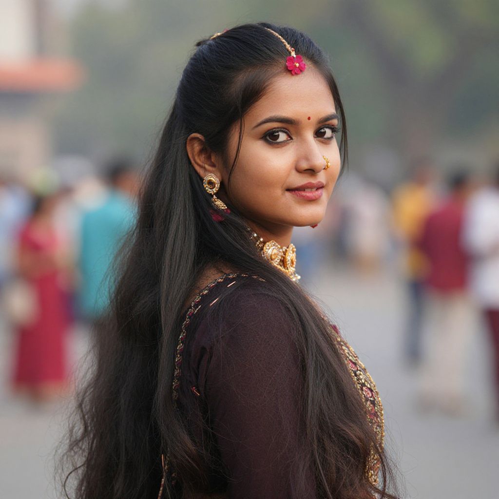 "girl indian costume, 1girl, solo, jewelry, black hair, braid, necklace, earrings, dark skin, dark-skinned female, realistic, twin braids, looking at viewer, blurry background Realistic photo of casual sexy person with pretty face"