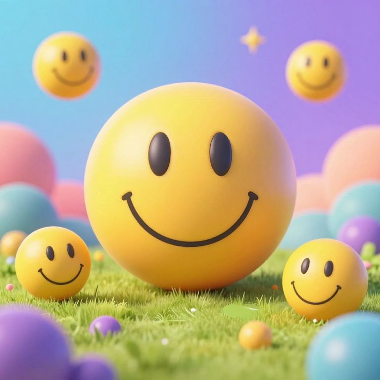 Simles design featuring whimsical, colorful smiley faces in a surreal landscape, vibrant background with floating shapes, dreamy atmosphere, playful and joyful mood, highly detailed, digital art style.