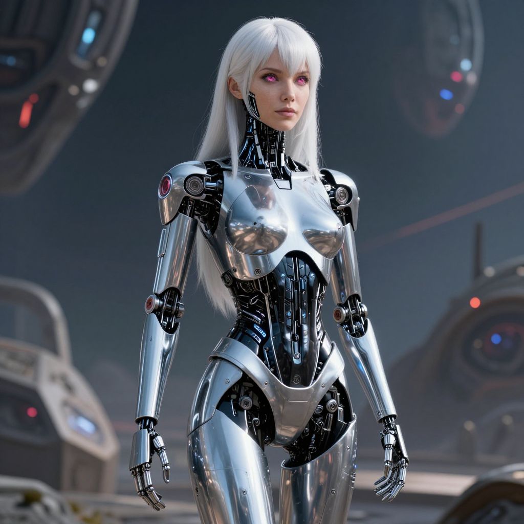 CGI image of a white-haired, silver and black robotic woman with pink eyes, standing in a futuristic, sci-fi industrial background.