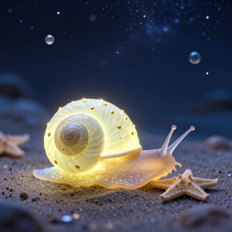 Glowing snail with a luminous spiral shell adorned with golden dots and a starfish rests gracefully on a bed of sand, its translucent antennae reaching toward a starry night sky dotted with floating orbs.