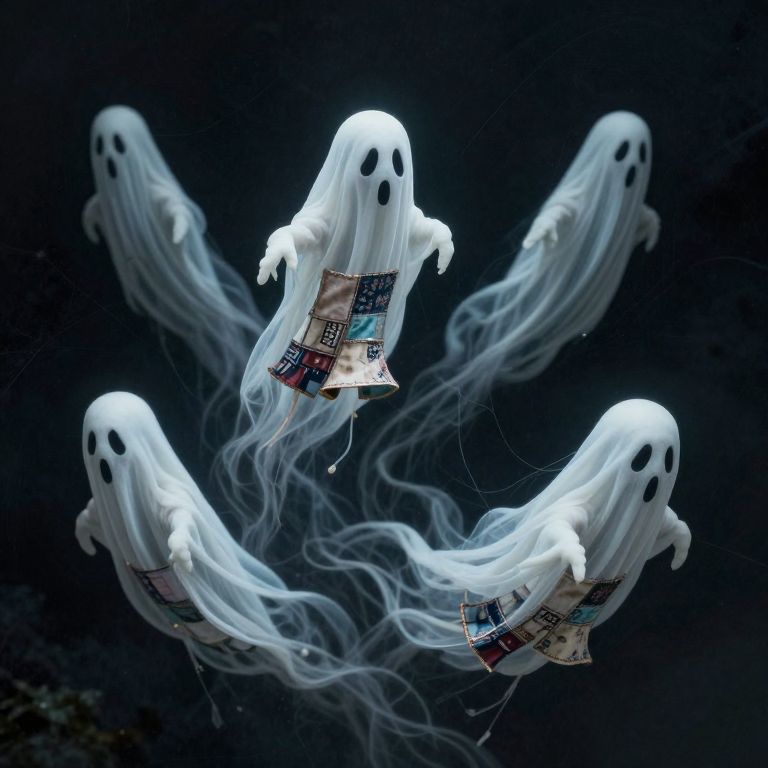Ghosts with patchwork bellies fly backwards through time, trailing streams of forgotten memories behind them like ribbons.
