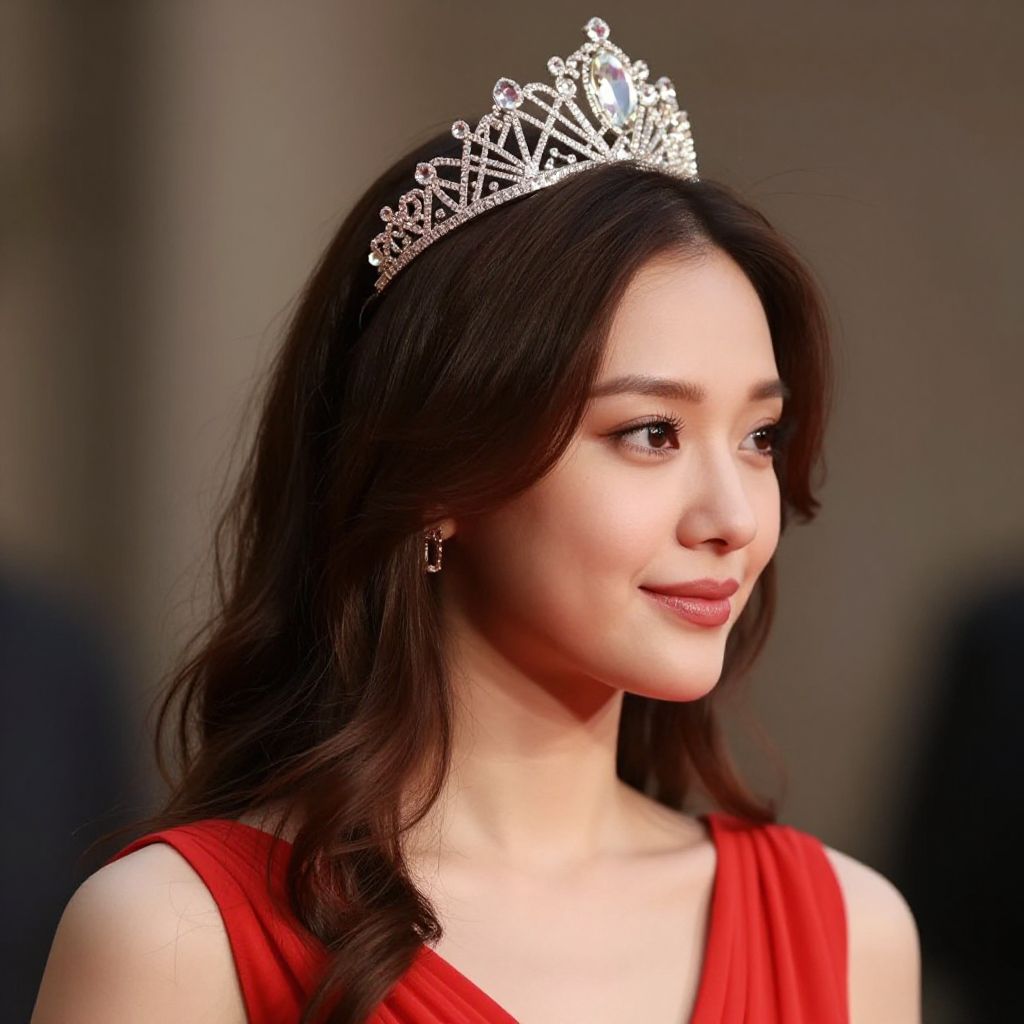 Photograph of an Asian woman with fair skin and long, wavy black hair, wearing a sparkling silver tiara with intricate design. She has delicate features, subtle makeup, and is dressed in a sleeveless, vibrant red gown. She is looking to her right with a slight smile. Her dark brown eyes are accentuated with mascara and eyeliner. The background is blurred, with dark and neutral tones, keeping the focus on her. She wears small, dangling earrings, and the light highlights her smooth skin and elegant appearance.