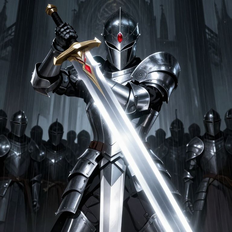 Digital artwork of a knight in shiny, silver armor with a red gem on the forehead, holding a glowing white sword with a gold hilt. The knight is in a dynamic, battle-ready stance under a rainy, dark cathedral backdrop. Silhouetted, armored figures stand in the background, partially obscured by rain and shadows. The knight's armor is detailed with intricate patterns, and the sword emits a bright, almost luminescent light, contrasting with the dark, moody background. The scene evokes a sense of epic fantasy and heroism.
