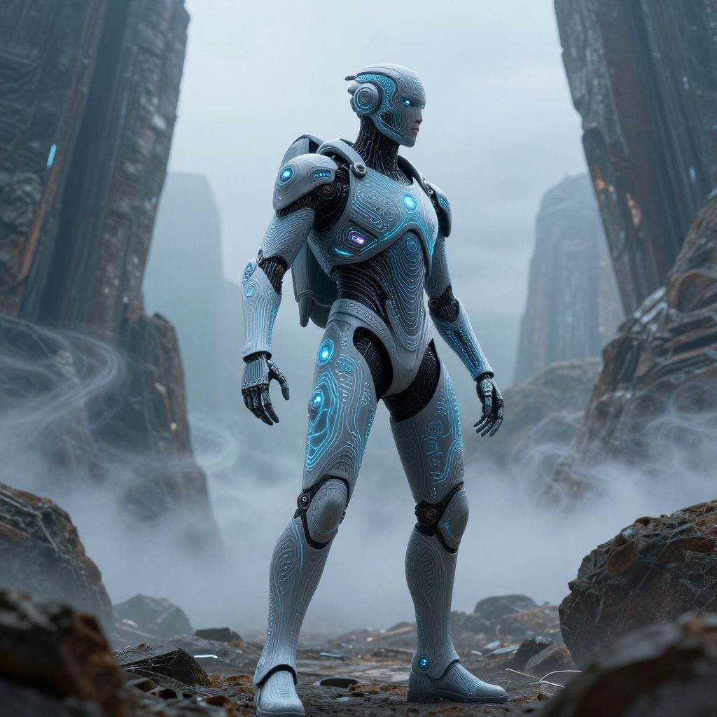 Photorealistic CGI image of a sleek, humanoid, white and blue cybernetic warrior standing in a foggy, rocky, futuristic landscape. The robot has a muscular build, glowing blue circuit patterns, and a smooth, featureless face with a metallic headpiece. The background features towering, weathered structures and mist, creating a sci-fi atmosphere. The robot's arms and legs have articulated joints, and its chest and shoulders are adorned with luminescent blue accents. The ground is rocky and uneven, with visible cracks and debris. The overall scene is moody and dramatic, emphasizing the advanced technology and futuristic setting.