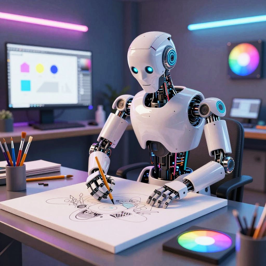 Illustrator AI tools visualized as an advanced robotic artist working on a canvas, surrounded by digital brushes, vector shapes, and color wheels, set in a modern studio with neon accents, blending technology and creativity in a vibrant, detailed style.