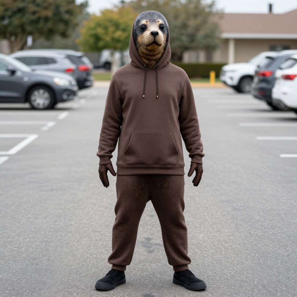 Photograph of a person wearing a full brown hoodie and pants set with a realistic seal head mask, standing in an empty parking lot with blurred cars and