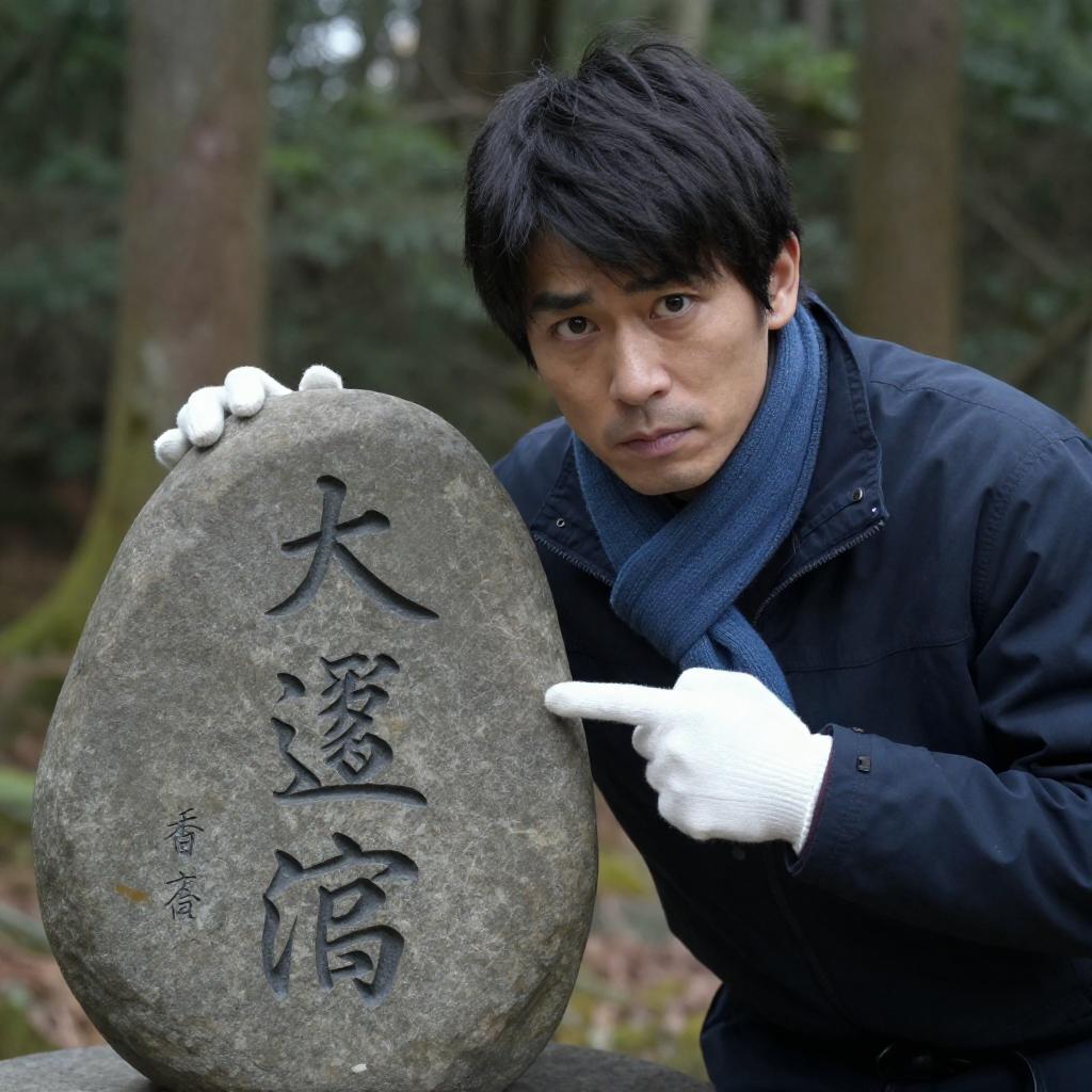 A man with short black hair and an intense expression is leaning forward and pointing at a large, oval-shaped stone engraved with Japanese characters. He is wearing a dark jacket, a blue scarf, and white gloves. The background features a forest with trees and greenery, suggesting an outdoor natural setting.