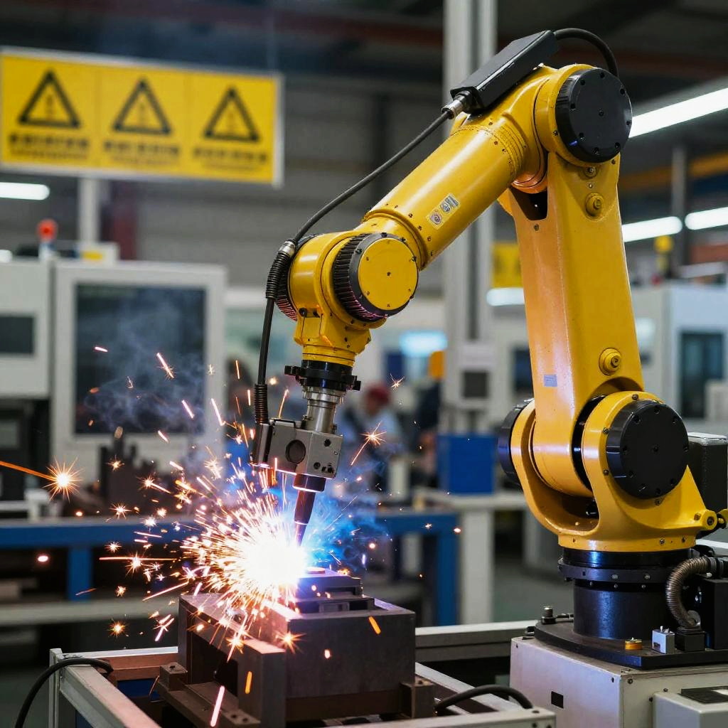 Kuka robot performing precise welding tasks in an automotive assembly line, sparks flying, dynamic motion blur, highly detailed robotic arm with intricate hydraulic components, vibrant industrial background with safety signs and complex machines, photorealistic