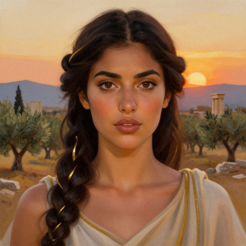 Athina, an artistic portrait of a woman with deep brown eyes and olive skin, long dark hair braided with golden threads, set against a backdrop of olive groves and ancient ruins at sunset, warm palette, painterly style with soft brush strokes
