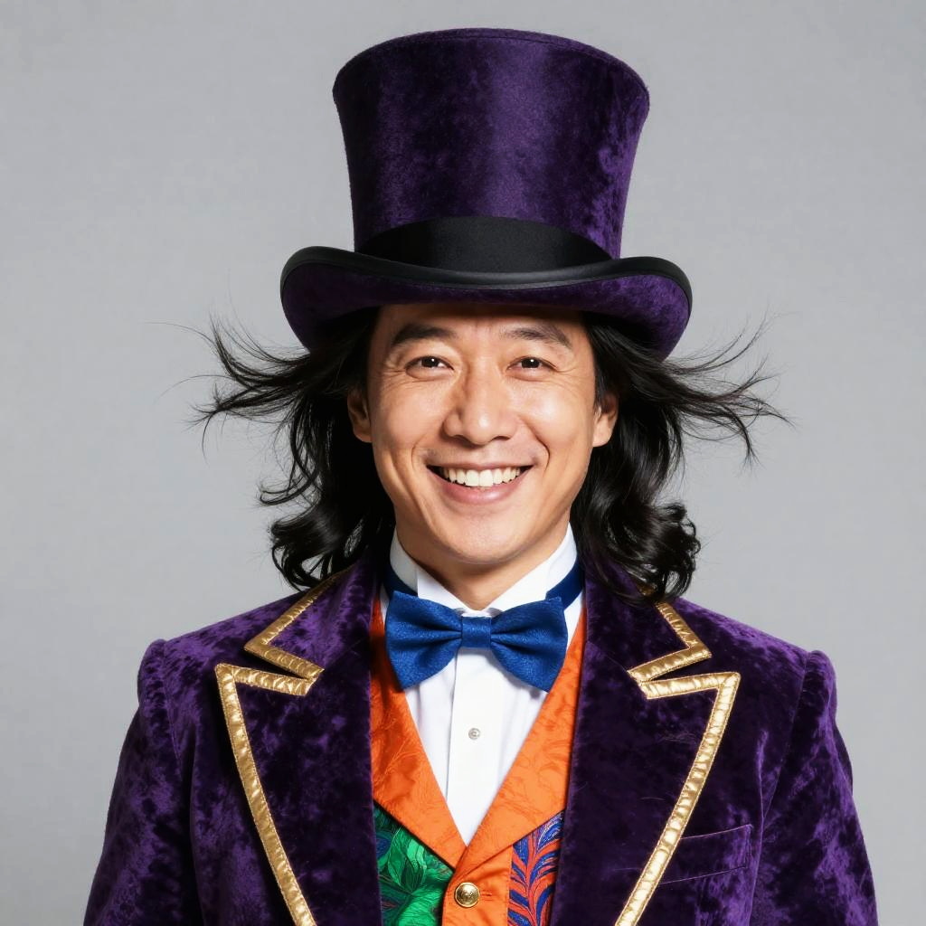 Photograph of a smiling Asian man with medium skin tone and black, wavy hair wearing a tall, purple top hat and a matching velvet coat with gold trim. He has on a white shirt, blue bow tie, and an orange vest with green and blue detailing. The background is a plain, light gray, which makes the vibrant colors of his attire stand out. His expression is cheerful, and his eyes are slightly crinkled at the corners, adding to the friendly, approachable look. The image has a slightly exaggerated, whimsical style reminiscent of a circus performer or magician.