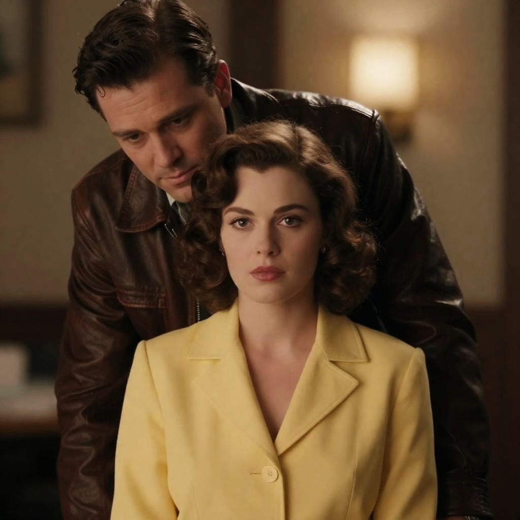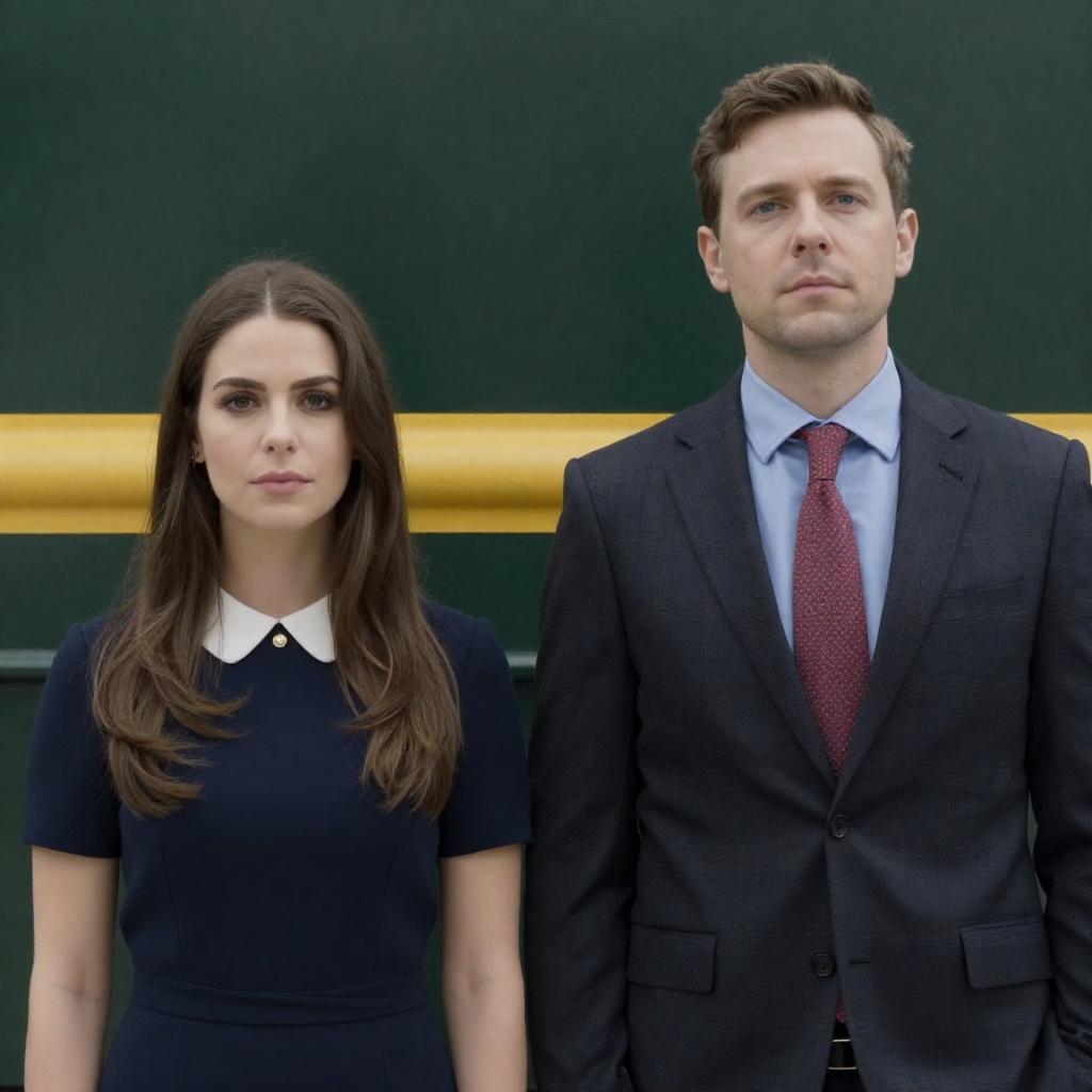 Photograph of a man and woman on stairs in a gritty urban setting. Man in black suit, white shirt, blue tie, walking left. Woman in green dress, black heels, walking right. Both looking forward. Concrete walls, rusty ures. Mid-20th century style.