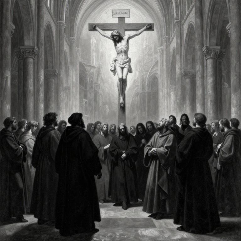 This black-and-white digital painting depicts a solemn church interior with a crucified Jesus at the center, suspended above a group of cloaked monks. Jesus, with a slender physique and long hair, hangs on a cross with a sign above reading "INRI." The monks, with varying expressions of reverence and contemplation, form a semi-circle around the crucifix. The high-arched, gothic-style architecture frames the scene, with intricate columns and a softly lit background. The monochromatic color scheme enhances the somber, reflective mood, emphasizing the historical and religious significance of the moment.