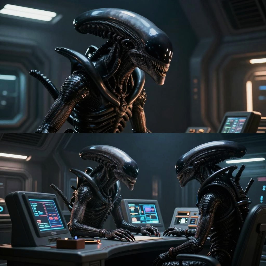 This image is a dark, sci-fi movie still, showing a split-frame shot of a menacing, alien creature with a long, ridged head and sharp teeth in a dimly lit, futuristic spaceship control room. The creature, with a slick, black exoskeleton, is seen in two different angles: one standing and looking forward, and the other sitting at a console with glowing screens. The background features metallic walls and overhead lights, adding to the high-tech, eerie atmosphere.