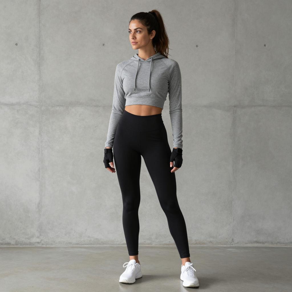 Winter gym clothes woman, photograph of a fit woman, standing in a minimalist indoor gym, wearing a grey long-sleeve crop hoodie, black high-waisted leggings, black fingerless gloves, and white sneakers, long dark brown hair in a high ponytail, neutral expression, concrete walls in background, natural light, fitness attire, athletic style, full body shot, realistic style, no background distractions, simple composition