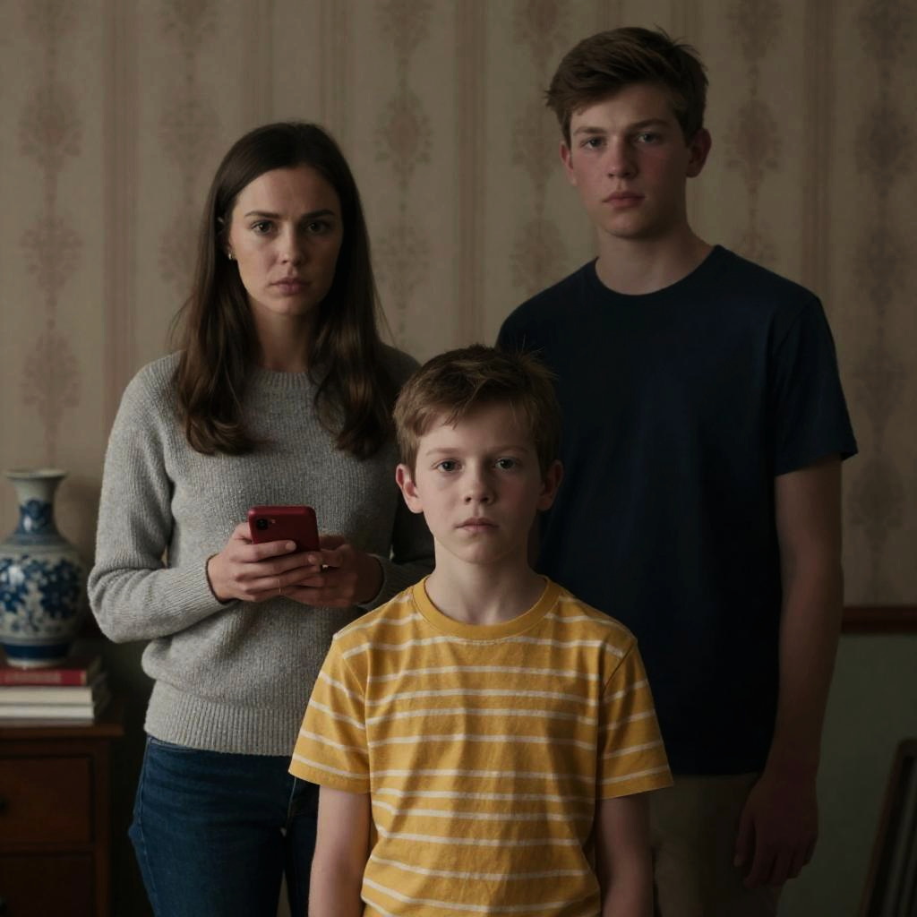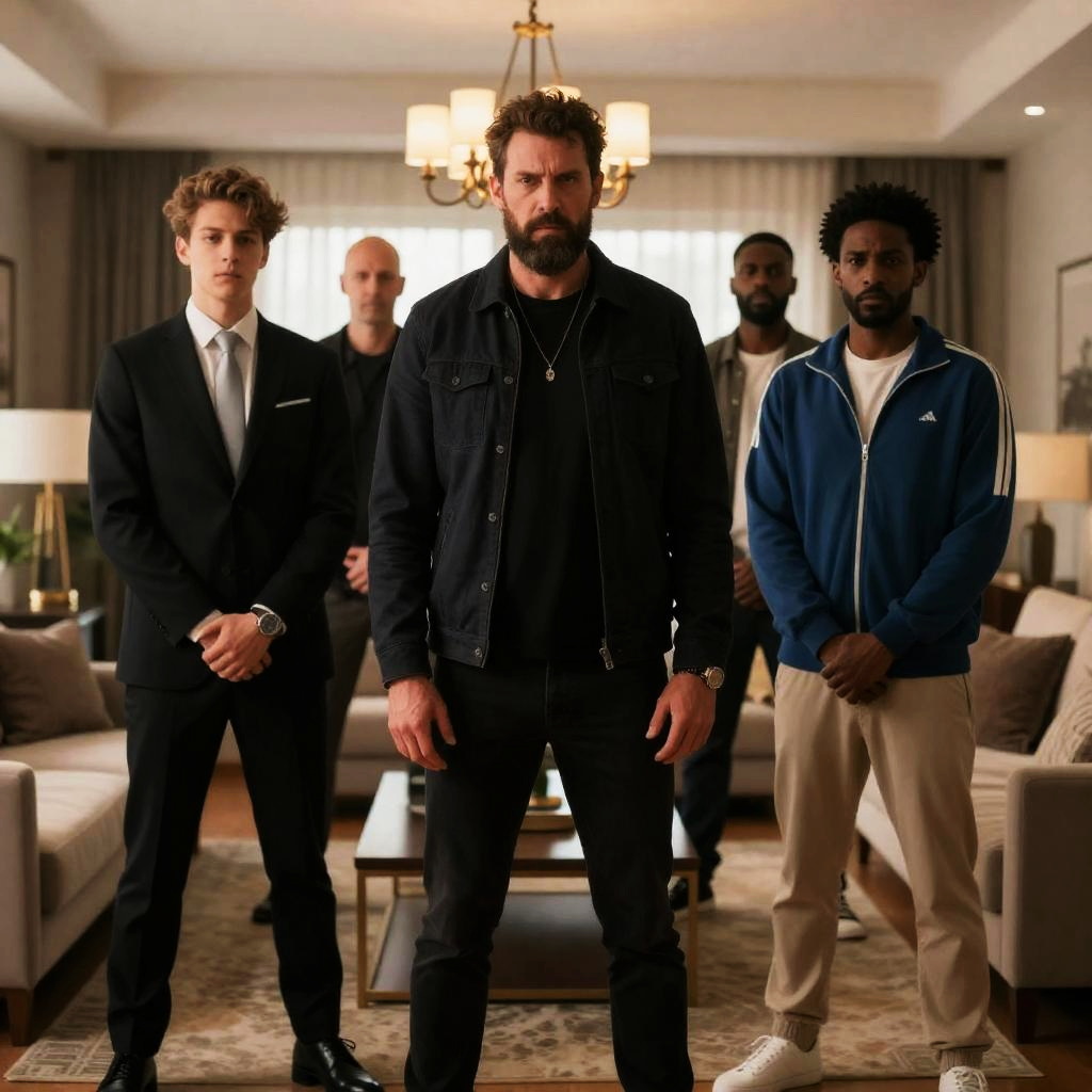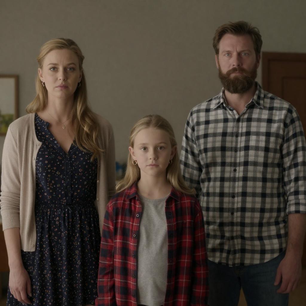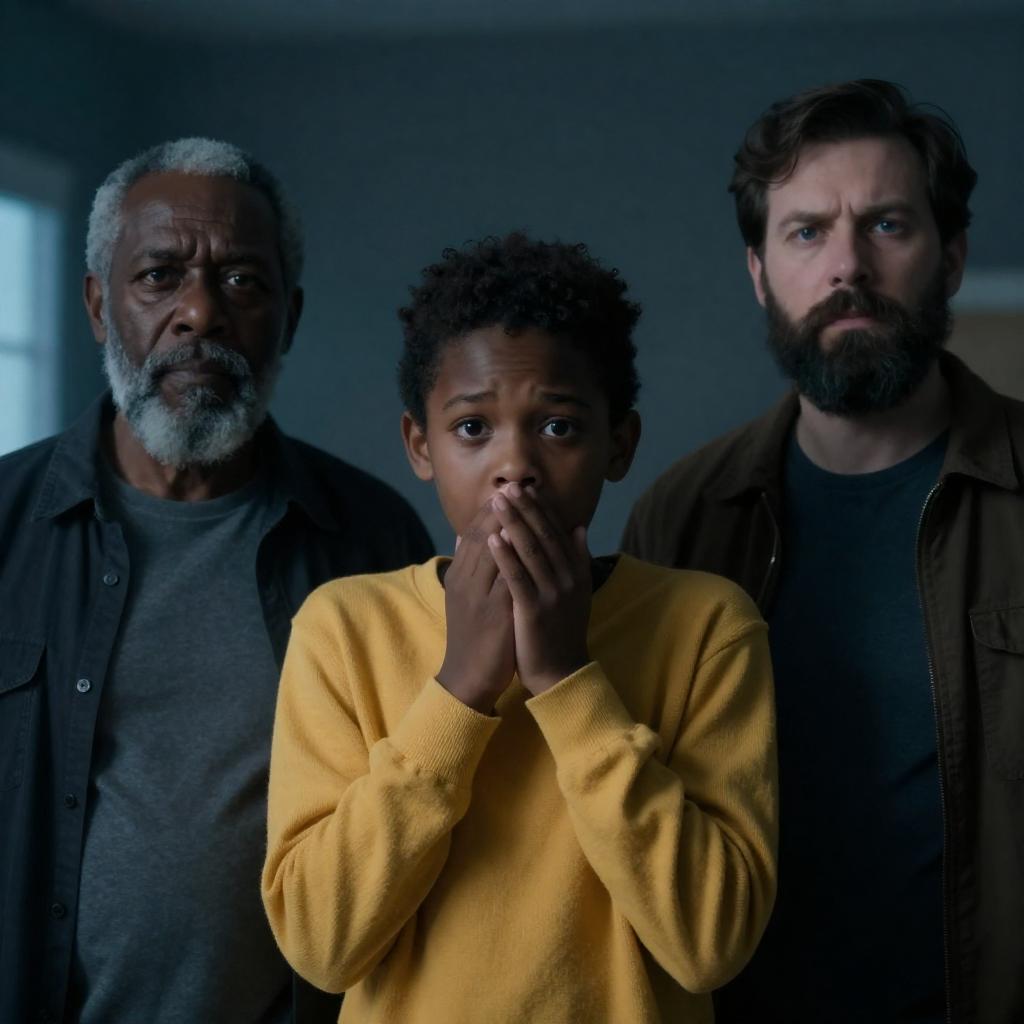 Three people in a dimly lit, blue-tinted room. An elderly black man with a graying beard on the left, a young black boy in a yellow sweater in the center covering his mouth, and a bearded white man with dark hair on the right. The boy's expression is fearful, the men's expressions are serious. A bright blue light illuminates the lower left.