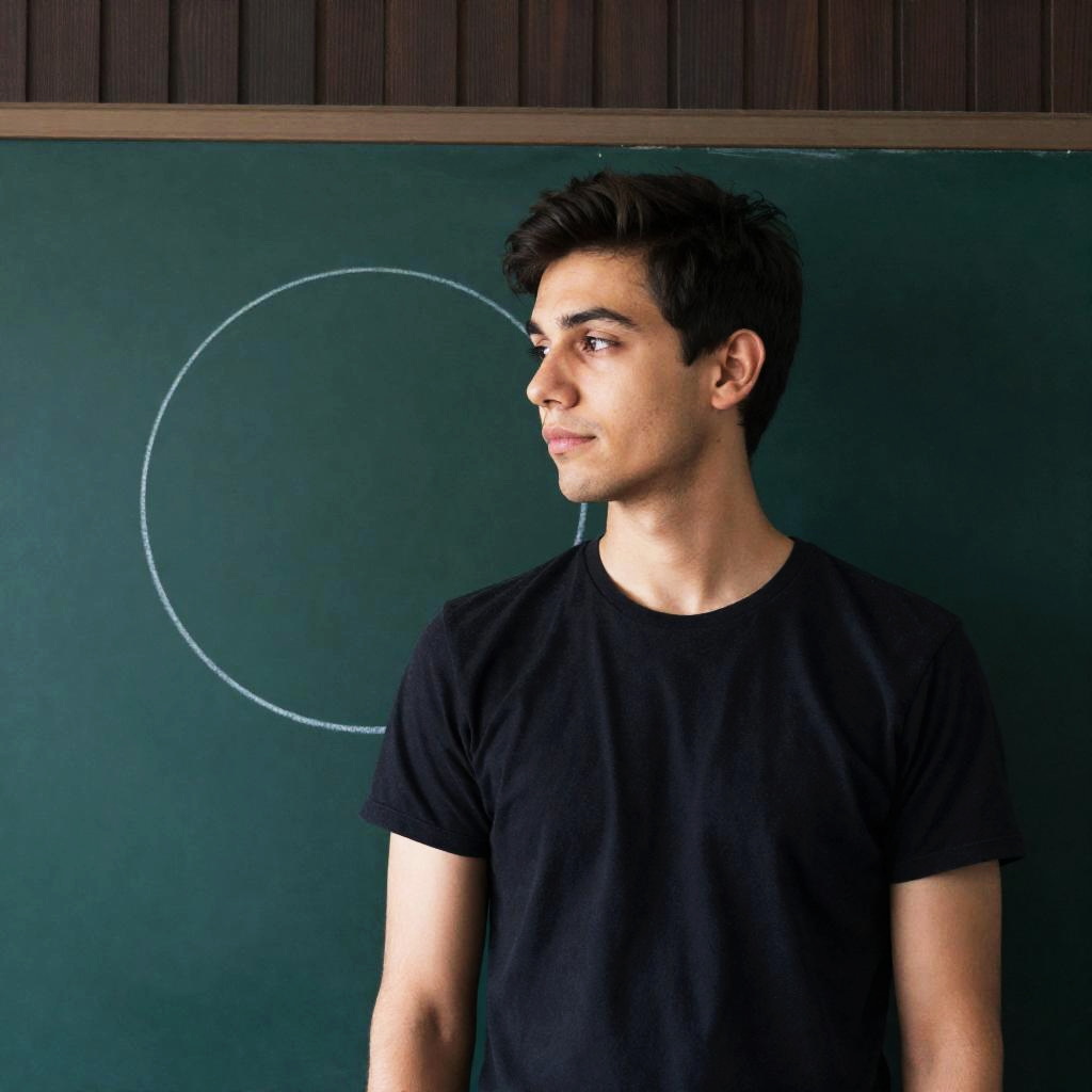 Photograph of a young man with short dark hair, wearing a black t-shirt, standing in front of a green chalkboard. He looks to the left with a neutral expression. A faint chalk circle is drawn on the chalkboard behind him. Dark wooden panel above the chalkboard. Lighting from the top left.