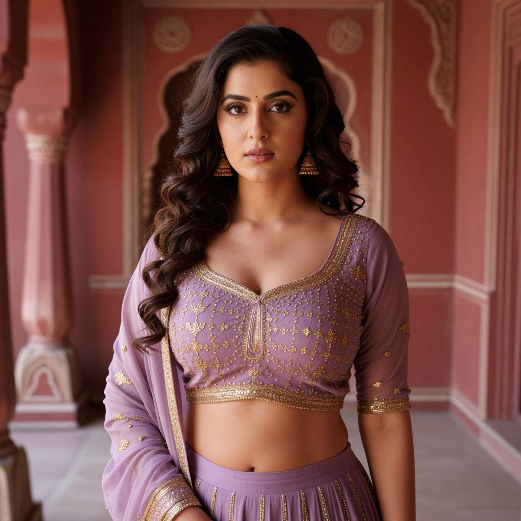 A cinematic portrait of a woman with soft rose-colored skin and long dark curls, wearing a light purple lehenga choli costume with gold thread patterns, taken in a vintage-style haveli with red walls and intricate carvings under soft afternoon sunlight, emphasizing the rich texture and deep color of the attire.. The woman has big tits and cute face