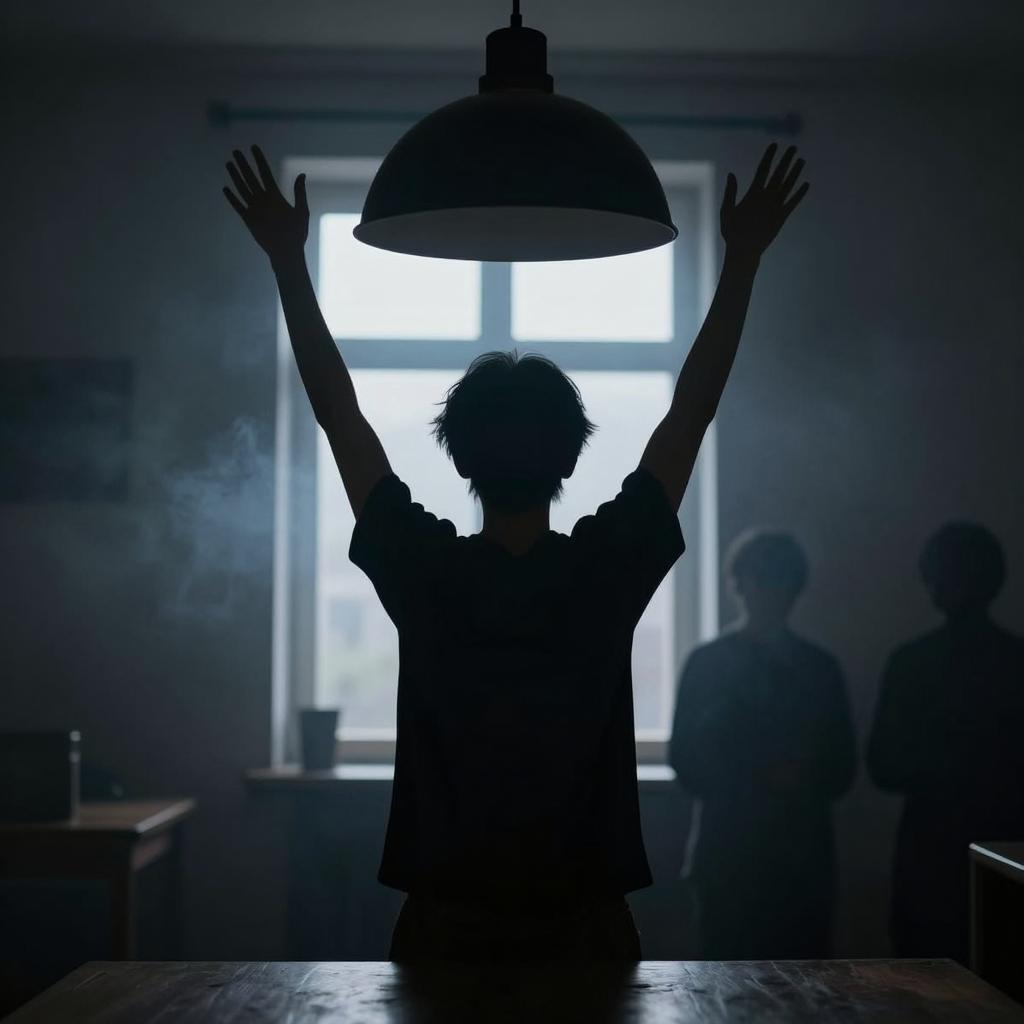 Silhouetted figure with raised arms standing in a dimly lit, smoky room. Large black pendant lamp hangs above. Blue light filters from the background, illuminating the figure from behind. Two indistinct dark shapes on the right.