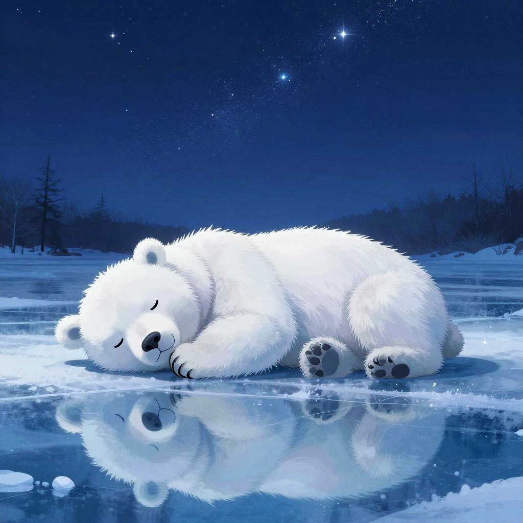 Digital illustration of a sleeping, white polar bear on a frozen, starlit icy landscape with a reflective surface and a dark, starry night sky background