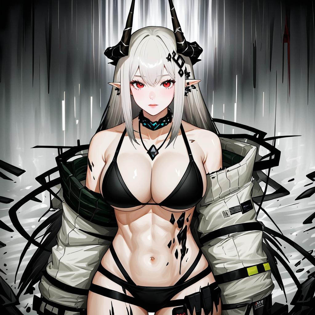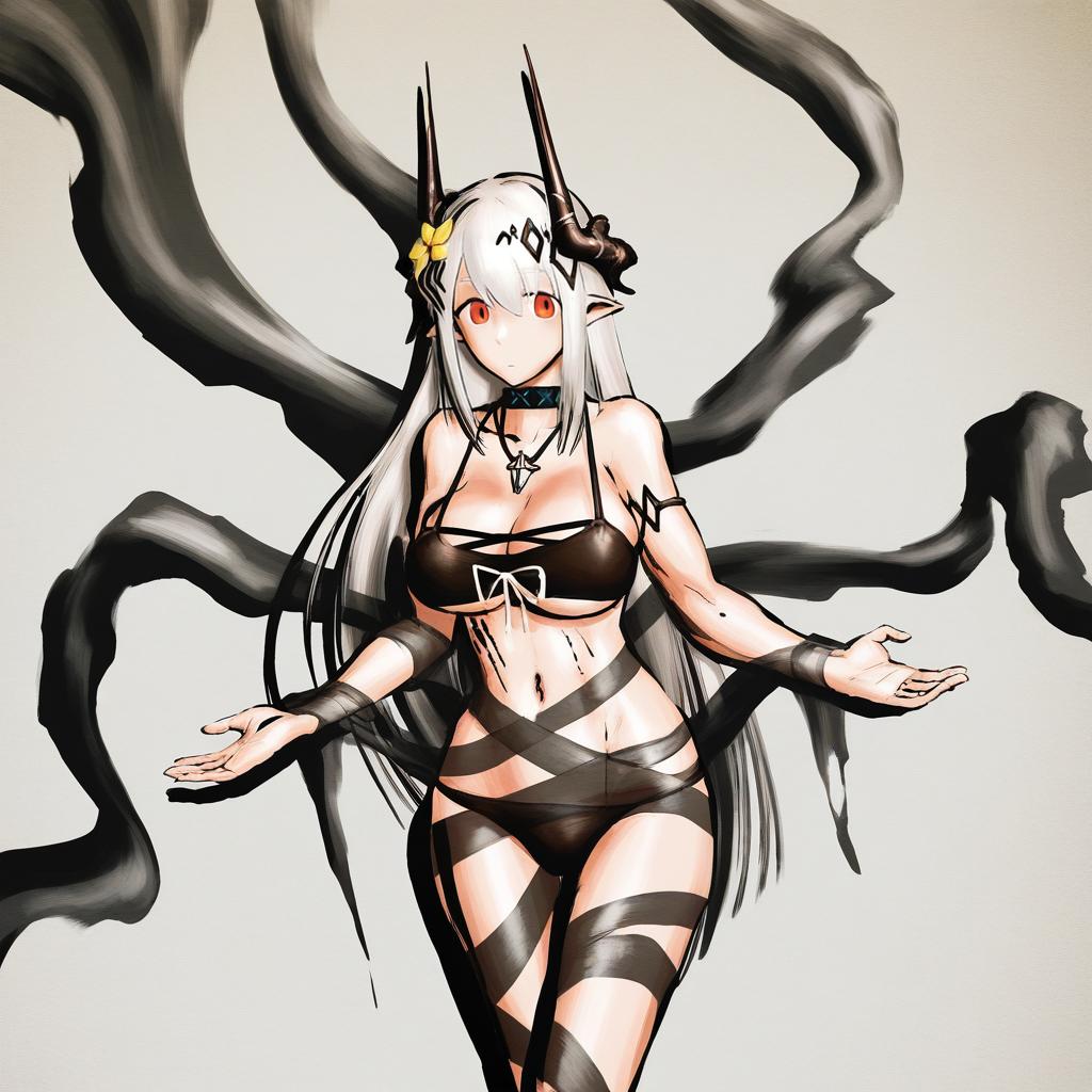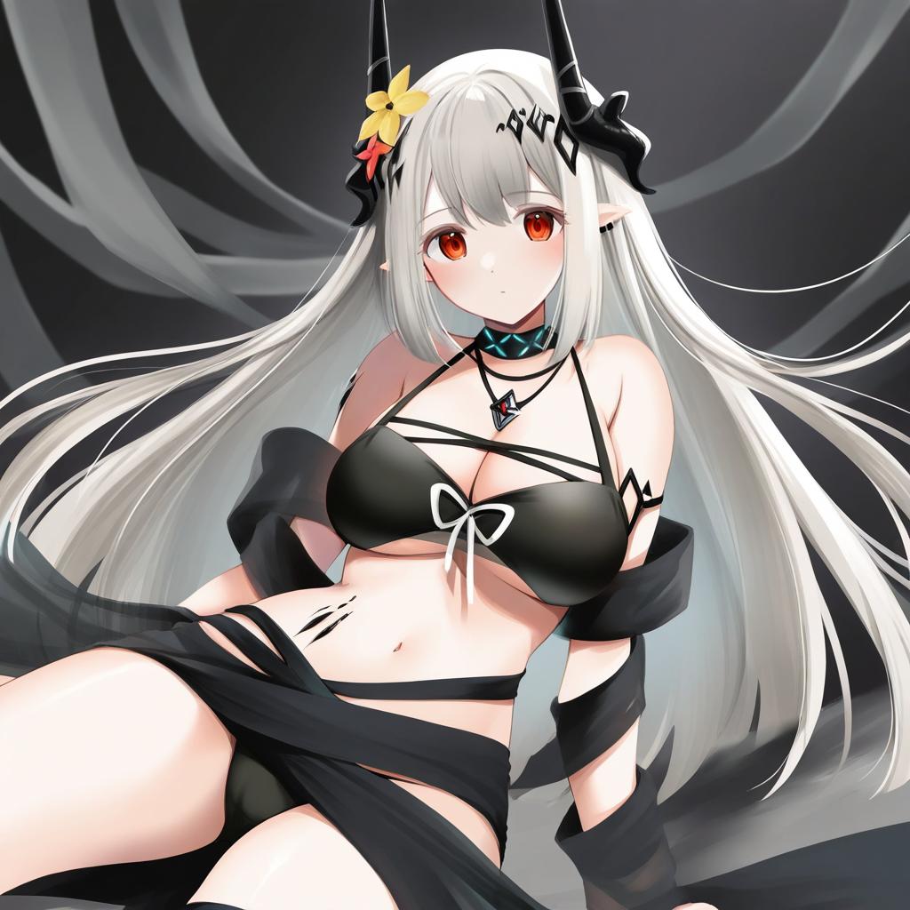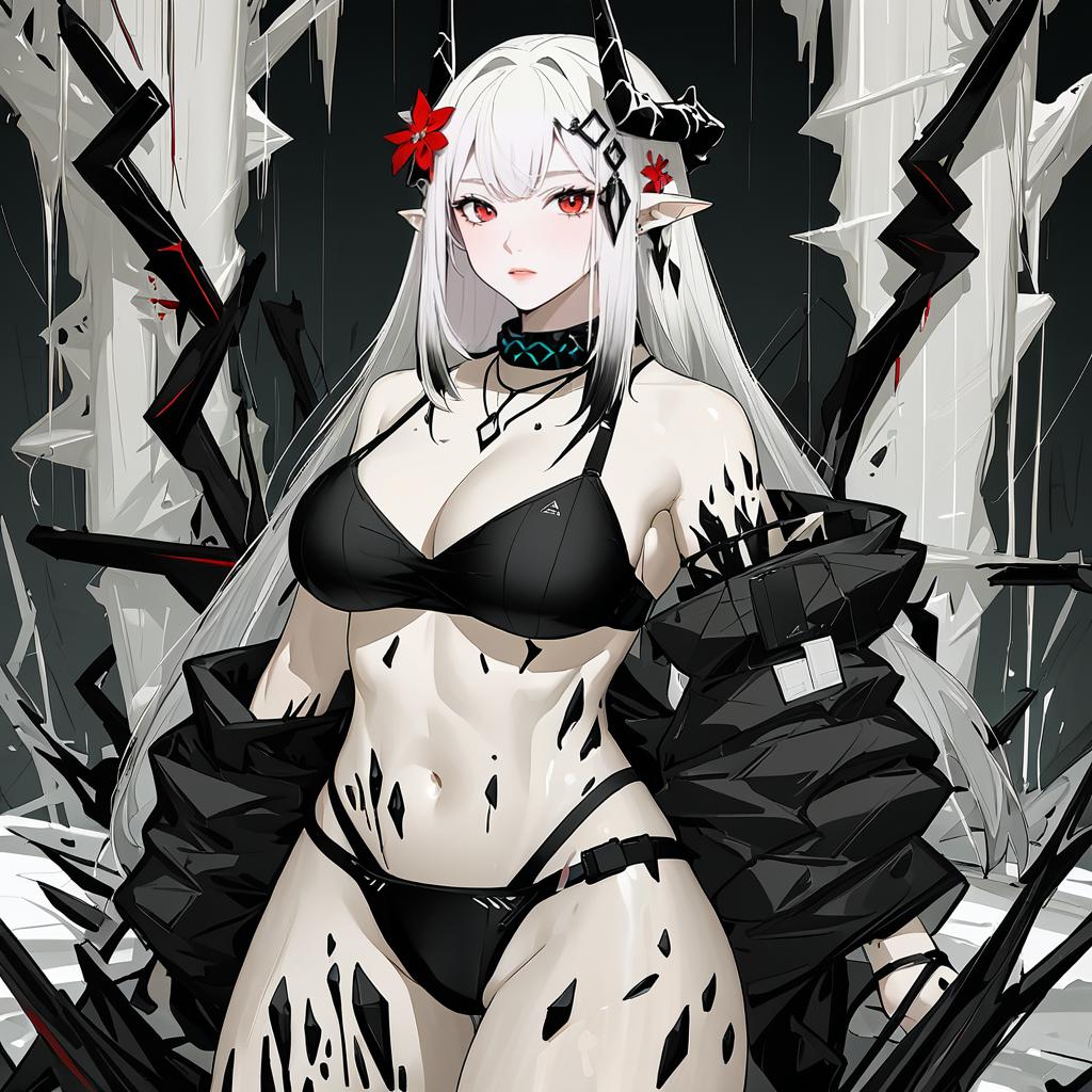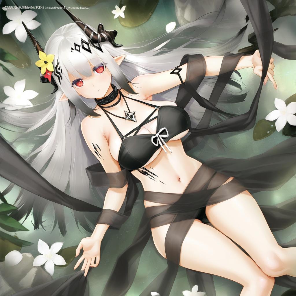 Mudrock (silent night) (arknights), arknights, 1girl, pointy ears, horns, red eyes, very long hair, white hair, grey hair, long hair, hair flower, large breasts, cleavage, thighs, navel, black bikini, bare shoulders, black choker, necklace, oripathy lesion (arknights), material growth, infection monitor (arknights), stomach, by artist choufu shimin, leet