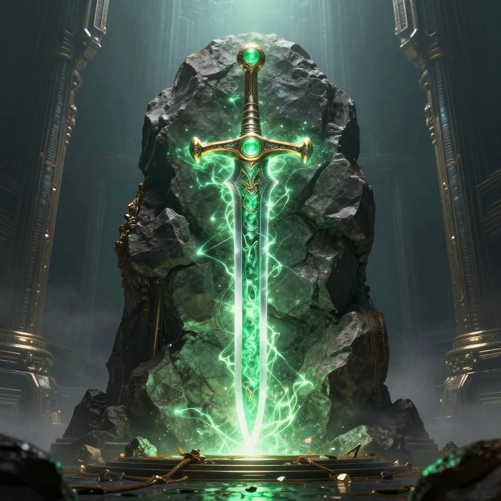 Energy sci fi sword embedded in alien stone altar, radiant green energy pulsing from the blade, ancient futuristic ruins, misty atmosphere, detailed textures, mysterious and mystical vibe