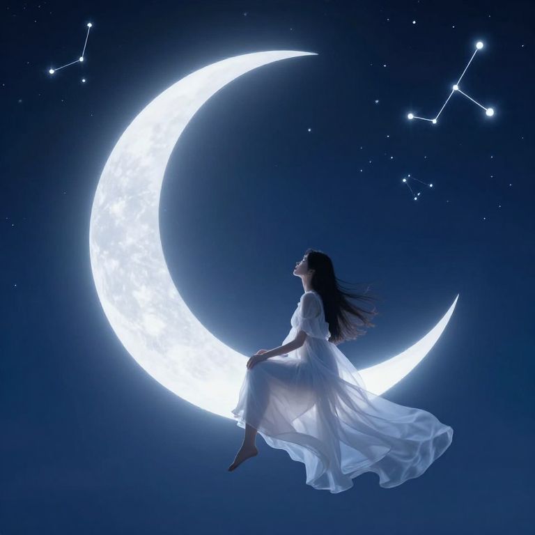 Girl sitting on moon, wearing flowing dress, large glowing crescent moon in a dark blue sky filled with constellations, surreal and mystical ambiance with soft lighting