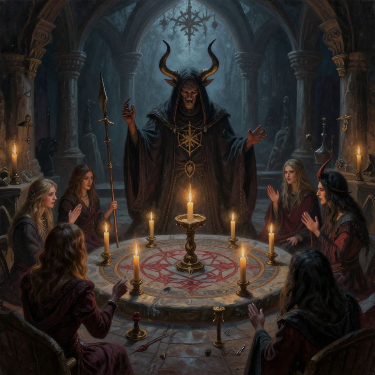 A dark, digital fantasy illustration depicts a demonic figure with black fur, horns, and a sinister grin, standing at the center of a dimly lit, gothic stone chamber. The figure, adorned in a dark cloak with intricate gold patterns, raises its hands, surrounded by five robed, pale-skinned, long-haired human figures with upturned hands, clapping in awe. They sit in a circle on stone benches around a central, glowing, candle-lit altar featuring a red pentagram. The background includes arches and shadowy details, enhancing the mystical, ominous atmosphere. The scene is illuminated by the warm light from multiple candles, contrasting with the cool, dark tones of the surroundings.