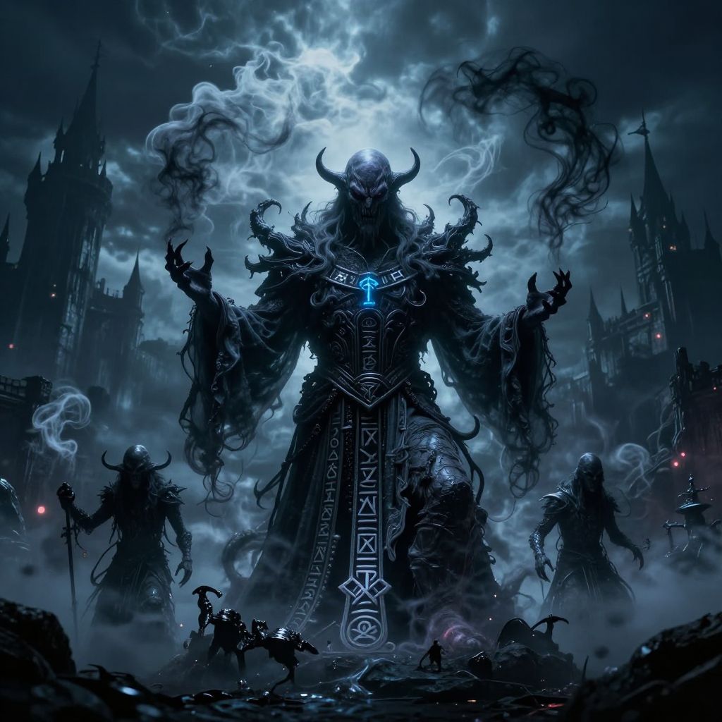 Fantasy digital artwork: dark horned figure with a sinister grin, robed, leads five worshipers seated around a glowing, candlelit pentagram