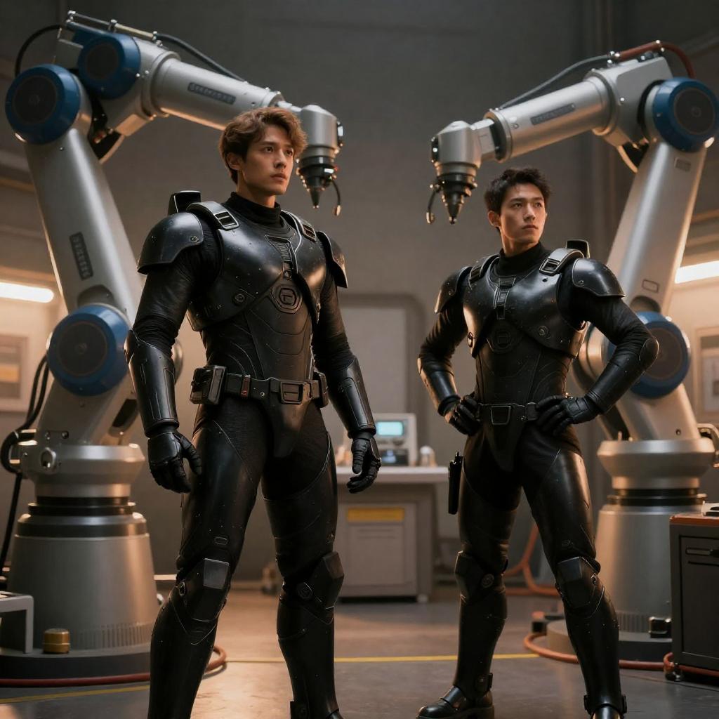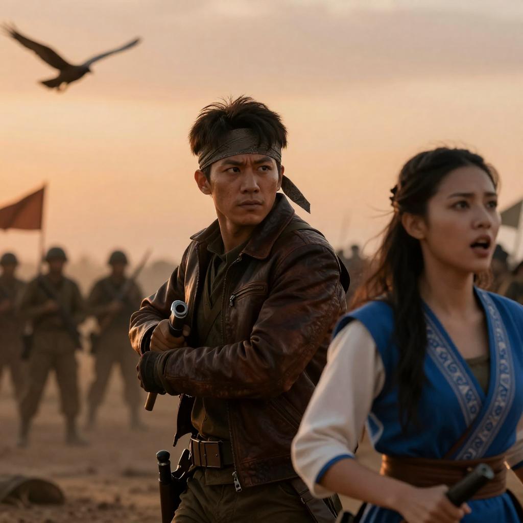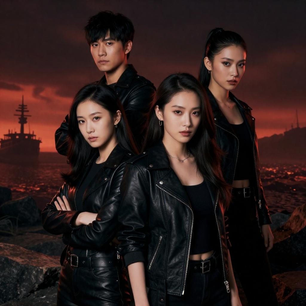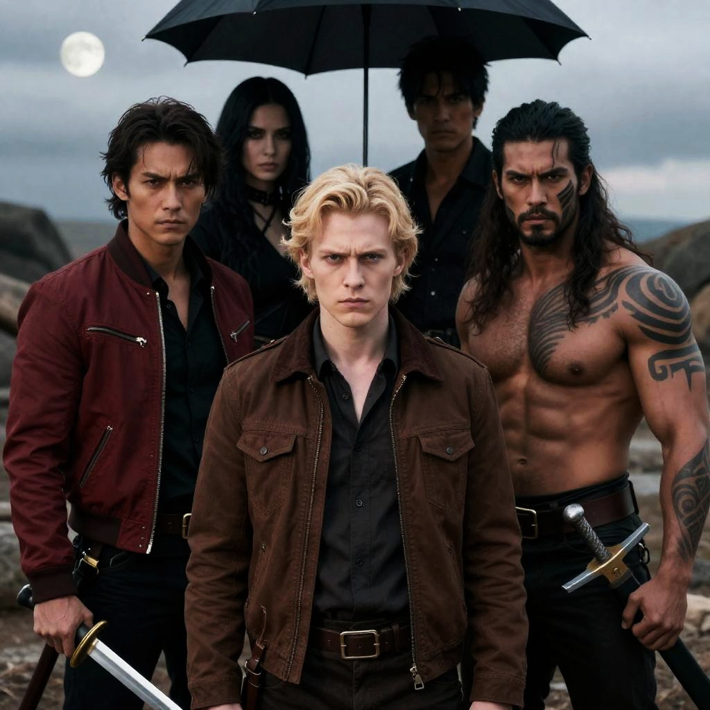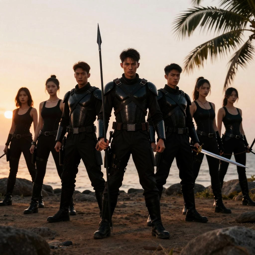 Group of six people in black, armored suits standing on rocky ground. Three men in center, one with spear, one with bow, one with sword. Three women to left and right. Sun setting in background. Palm leaves on top right. Intense expressions.