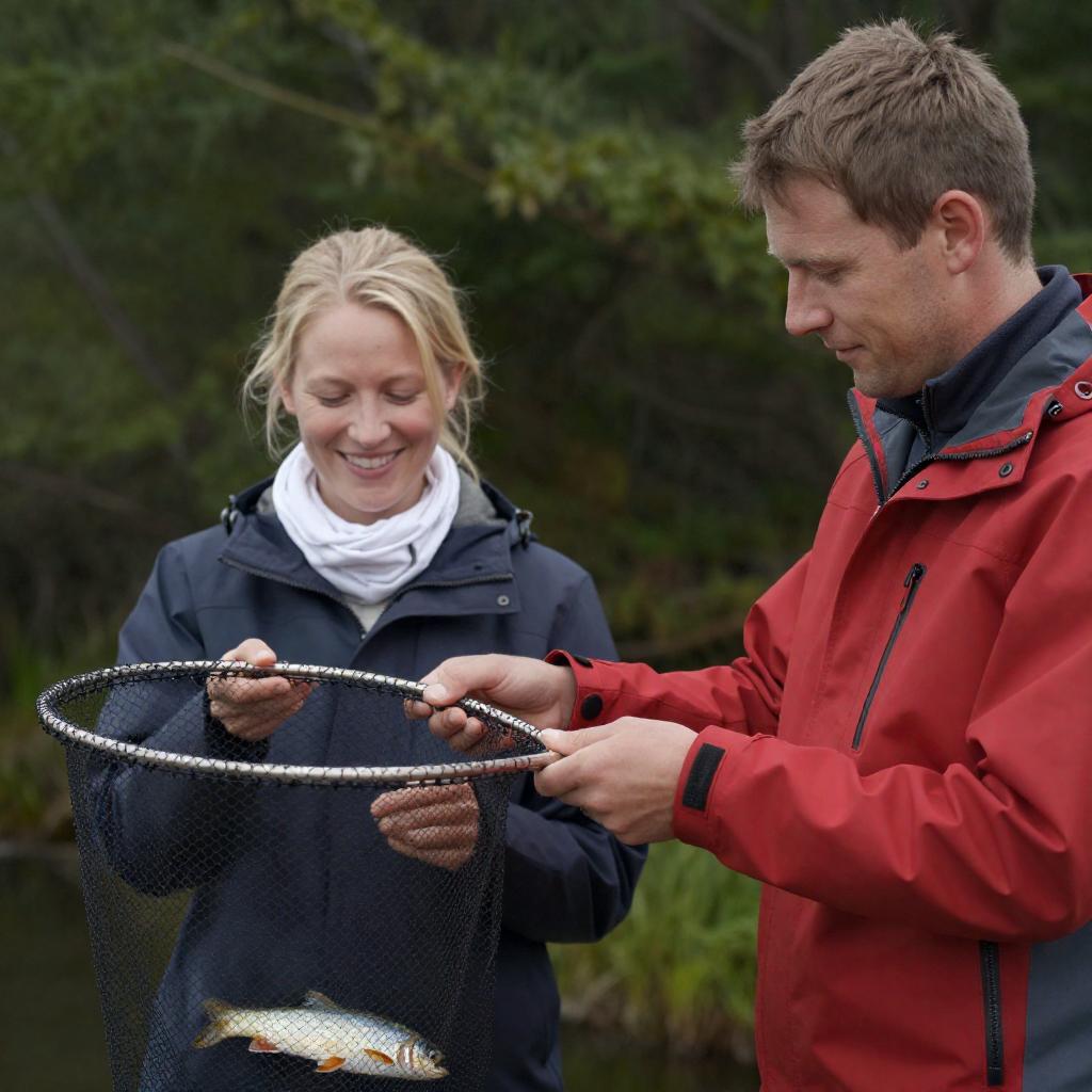 Black and white photograph of a man and woman standing close together outdoors. Both are wearing buttoned coats, the man with short dark hair and the woman with short curly dark hair. The man is holding a fish with both hands while the woman looks down at it. The background is blurred, emphasizing the couple and the fish.