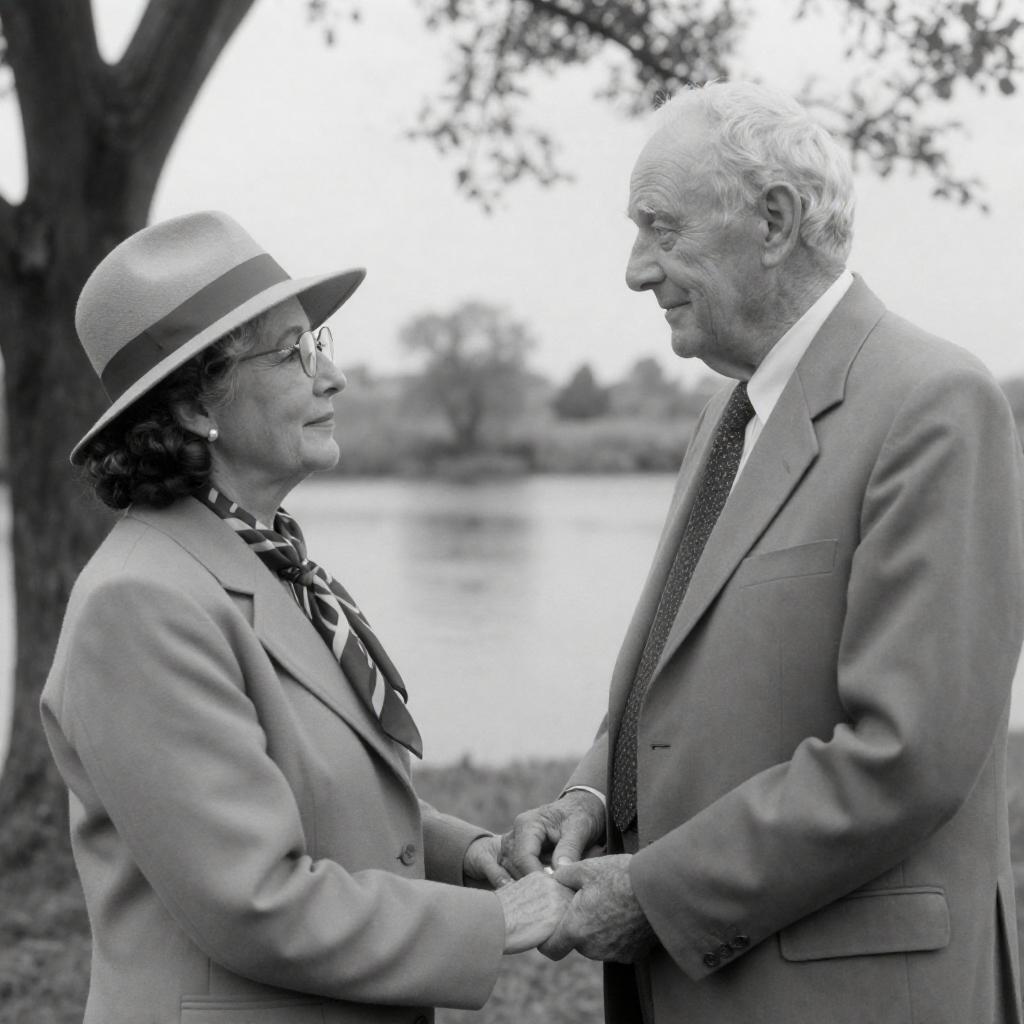 Black-and-white photograph of a man and woman standing close together, both wearing buttoned coats. The man, with short dark hair and a slightly tilted head, holds a fish. The woman, with short dark hair, looks down at the fish. The background is blurred, focusing attention on the subjects.