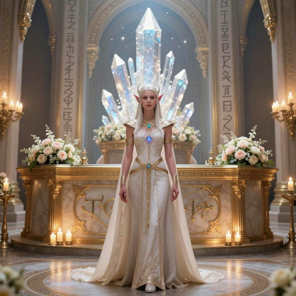 Reception from Tyrande, a powerful night elf priestess standing gracefully in a grand hall decorated with glowing crystals and ancient scripts, delicate floral arrangements and candles illuminating the room, ethereal and regal ambiance, highly detailed fantasy illustration.