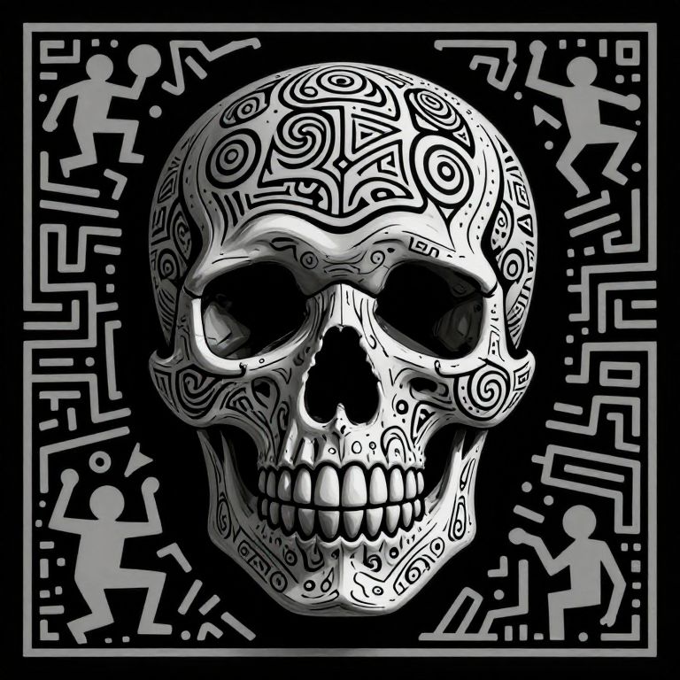 The image features a striking skull design, reminiscent of the work of Keith Haring and M.C. Escher, set against a black background. The skull is intricately detailed with a variety of patterns and symbols, including swirls and geometric shapes, creating a sense of depth and complexity. The skull is centrally positioned, with its detailed carvings and patterns filling the frame. Surrounding the skull is a border composed of similar intricate designs, adding to the overall sense of symmetry and balance. The interplay of light and shadow enhances the three-dimensional effect, making the skull appear almost lifelike. The use of monochromatic tones, primarily shades of gray, gives the image a timeless and classic feel. The overall composition is harmonious, with the skull and its intricate patterns dominating the visual space.
