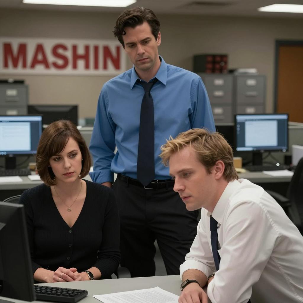Group of five people standing in a line, indoors. Woman in center with short brown hair, light pink blouse, holding black folder, looking down. Blonde man on right, leather jacket, looking at her. Three men on left, dark hair, suits, looking at her. Background: orange wall, white sign with "REGISTRATION". Casual 1980s style.