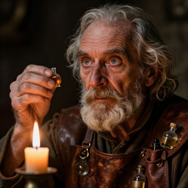 A captivating portrait of an aged alchemist, his face etched with lines of experience and bathed in the soft glow of candlelight, conveys a sense of wisdom. From a unique 'bug's-eye view', capture the glint in his eyes as he examines a mysterious elixir, his expression reflecting both curiosity and caution. The worn leather apron he dons, adorned with an assortment of pouches and vials, hints at a myriad of experiments and discoveries. This intimate close-up should evoke a sense of wonder and intrigue, combining hyperrealistic details with a carefully crafted studio lighting setup that accentuates the depth and texture of his skin, casting dramatic shadows across his venerable visage.