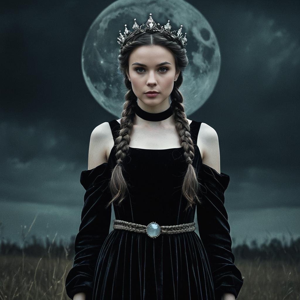 A very beautiful princess with sleek black hair, a glamorous gold gown, and a striking pearl tiara, in a glitch art style, digital and analog errors, gloomy background, detailed dress, high rendering, dark and intense mood, 1800x2700 pixels.