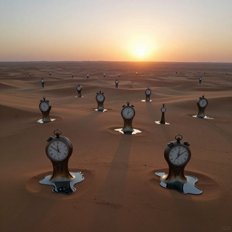Envision an expansive desert vista at dusk, where the horizon is dotted with towering, melting timepieces stretching endlessly into the distance. This surreal landscape is captured from a unique aerial perspective, drawing attention to the intricate details of the distorted clocks and their mirroring reflections on the sand below. The warm tones of the setting sun cast elongated shadows across the scene, bathing the warped metal and glass in an ethereal glow that evokes a sense of awe and introspection as light plays upon the peculiar structures. This mesmerizing image will transport viewers into a fantastical realm where time appears to warp and twist like its distorted forms, leaving behind a lasting impression of both wonder and surrealist beauty.