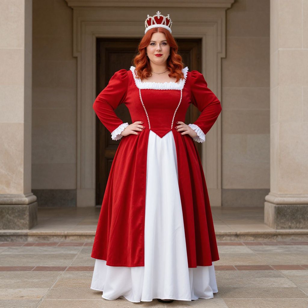 Red Queen Costume Plus Size, woman in red dress with crown and white dress posing for picture