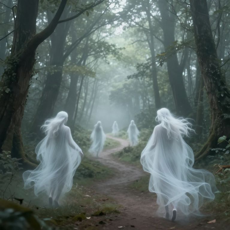 Digital artwork of ethereal, glowing white ghost figures with flowing cloaks, walking on a misty forest path, surrounded by tall trees and dense fog