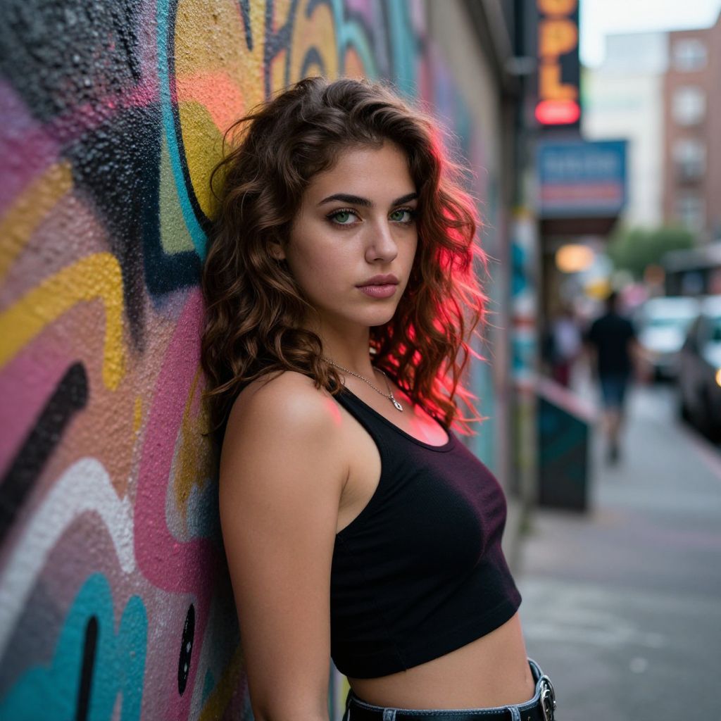 Imagine a portrait of a confident young woman, her olive skin and wavy chestnut hair illuminated by the neon glow of an urban alley. Leaning against a graffiti-covered wall, she exudes an air of relaxed self-assurance amidst the dynamic energy of the cityscape. The vibrant street art blends harmoniously with her attire, creating an intriguing interplay between subject and environment. This image captures both the raw edginess of the city and the quiet determination in her piercing green eyes - a deep connection between personal journey and urban narrative.