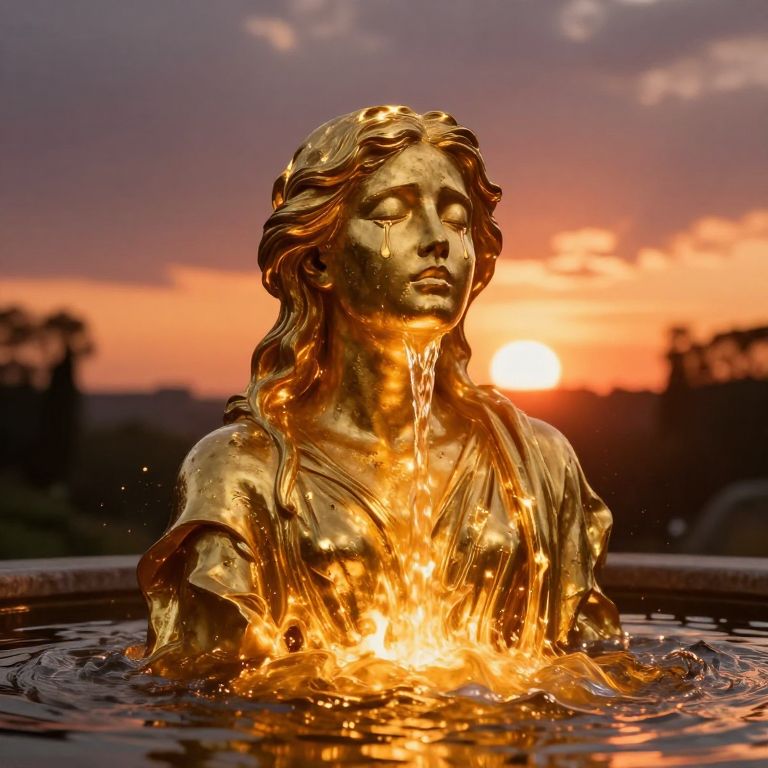 Amidst the fiery embrace of a setting sun, a statue weeps molten gold, symbolizing the transient beauty of impermanence and the relentless flow of time, as warmth and light cascade into a pool of eternal longing.