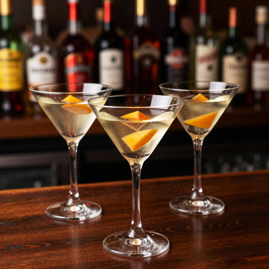A vibrant photograph of three elegant martini glasses on a dark wooden bar counter. The foreground glass is filled with a clear, slightly golden liquid and small, translucent fruit slices. The background features a blurred, colorful array of red and black liquor bottles, creating a lively, festive atmosphere. The image has a vivid, high-contrast style.