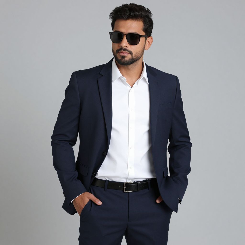 Photograph of a handsome, middle-eastern man with short, dark hair and a trimmed beard. He wears a black suit with a white dress shirt and black trousers, his hands in his pockets. He has black sunglasses on and a confident expression. The background is a plain, light gray color, making him the focal point. The suit is well-fitted, and the shirt is crisp and neatly buttoned. His overall look is stylish and sophisticated. The lighting is even, highlighting his features and attire.