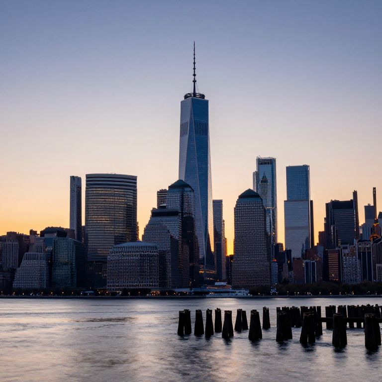 Photograph of New York City skyline at dusk, featuring One World Trade Center, silhouetted against a gradient sky, with wooden piers in