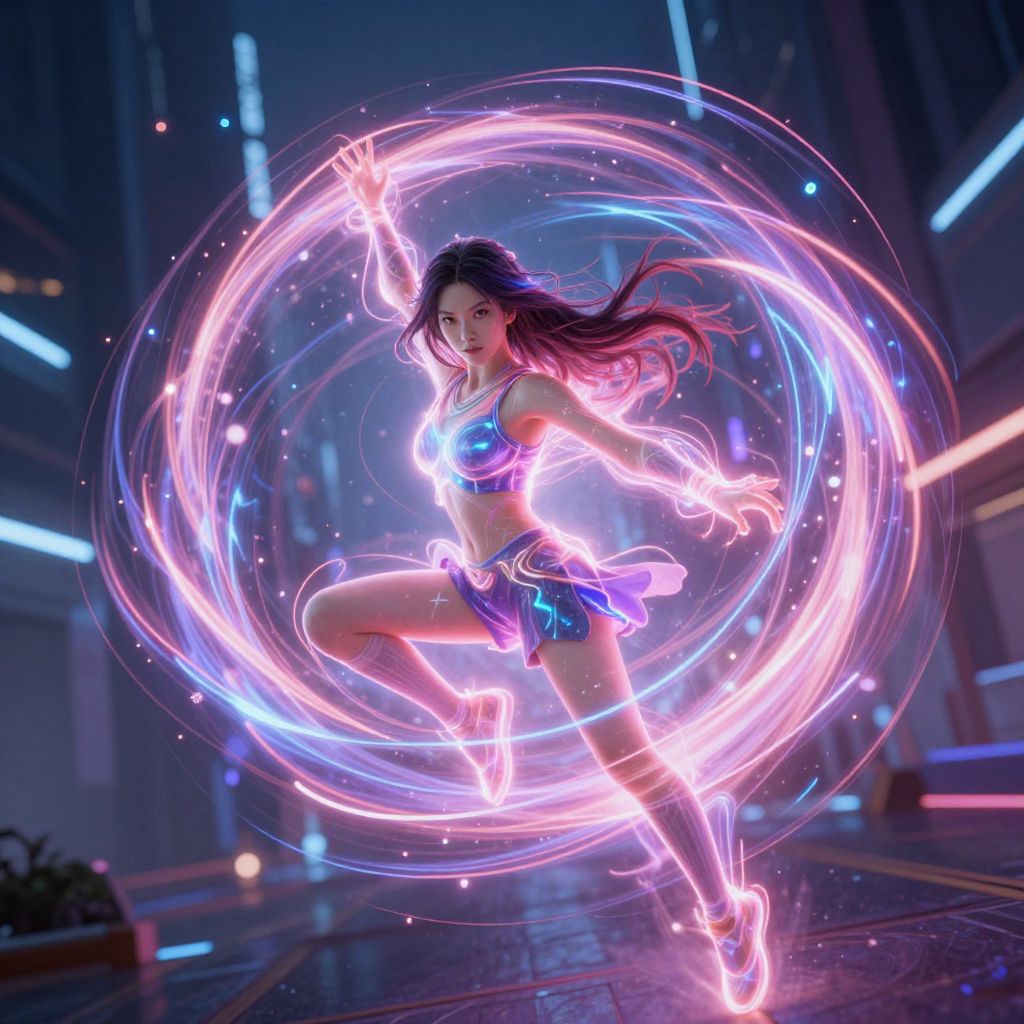 A digitally rendered young woman with telekinetic powers surrounded by a swirling glowing energy field. She has long dark hair with purple highlights and wears a futuristic blue and purple athletic outfit including a crop top, skirt, and sneakers. The background features a vibrant futuristic urban environment with neon lighting and dynamic motion effects, emphasizing a sci-fi fantasy art style.