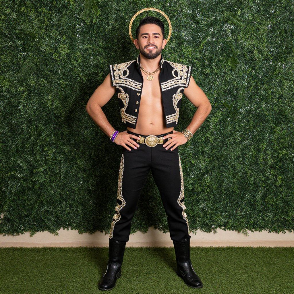 Mexican wrestler costume, 1boy, solo, male focus, jewelry, hands on own hips, boots, looking at viewer, smile, necklace, standing, full body, plant, facial hair, bracelet, halo, pants
