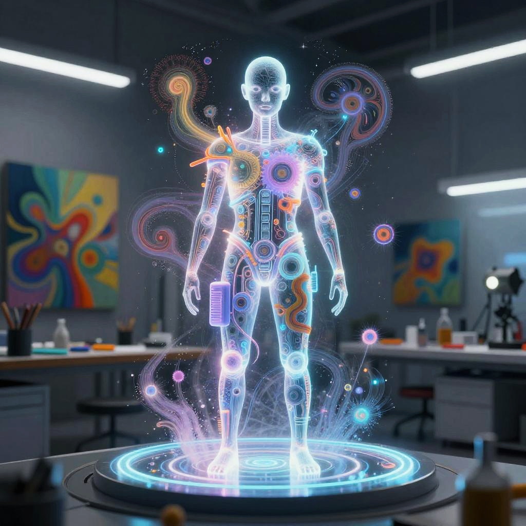 AI Holographic Entity in Futuristic Creative Lab