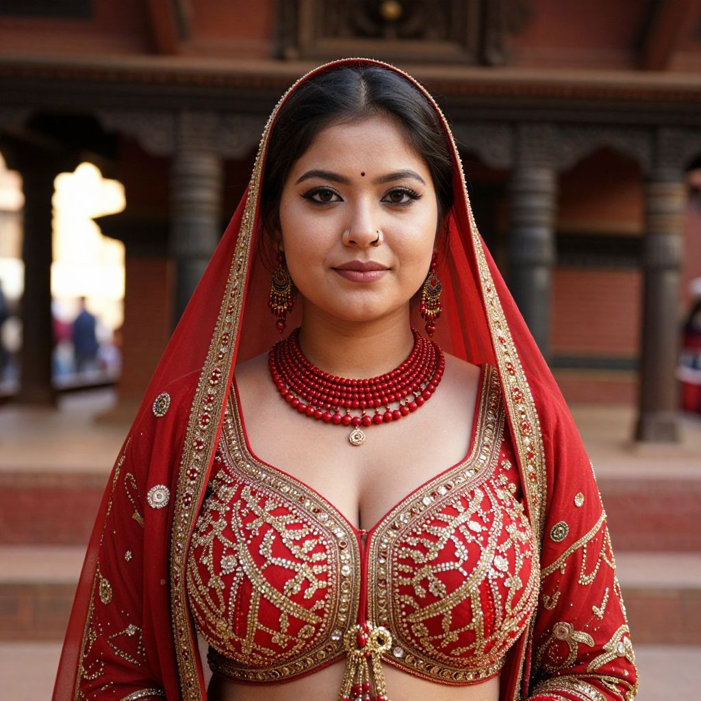 A strong, confident Nepalese traditional woman with a sharp nose, high cheekbones, and dark brown eyes, wearing a red bead and gold-threaded lehenga with intricate patterns, standing in front of a temple in Bhaktapur, with sunlight streaming through the arches, photorealistic, high detail, traditional attire, cultural authenticity. The woman has big tits and cute face